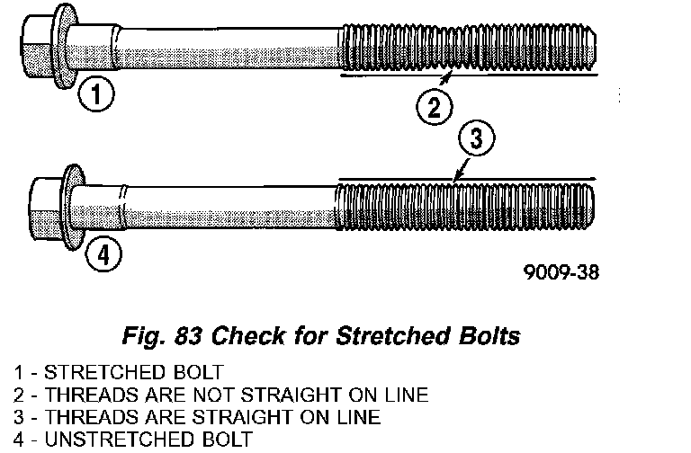 2. Check connecting rod bolts for necking by holding a scale or straight edge against the threads. If all threads do not contact the scale, the bolt must be replaced (Fig. 83).