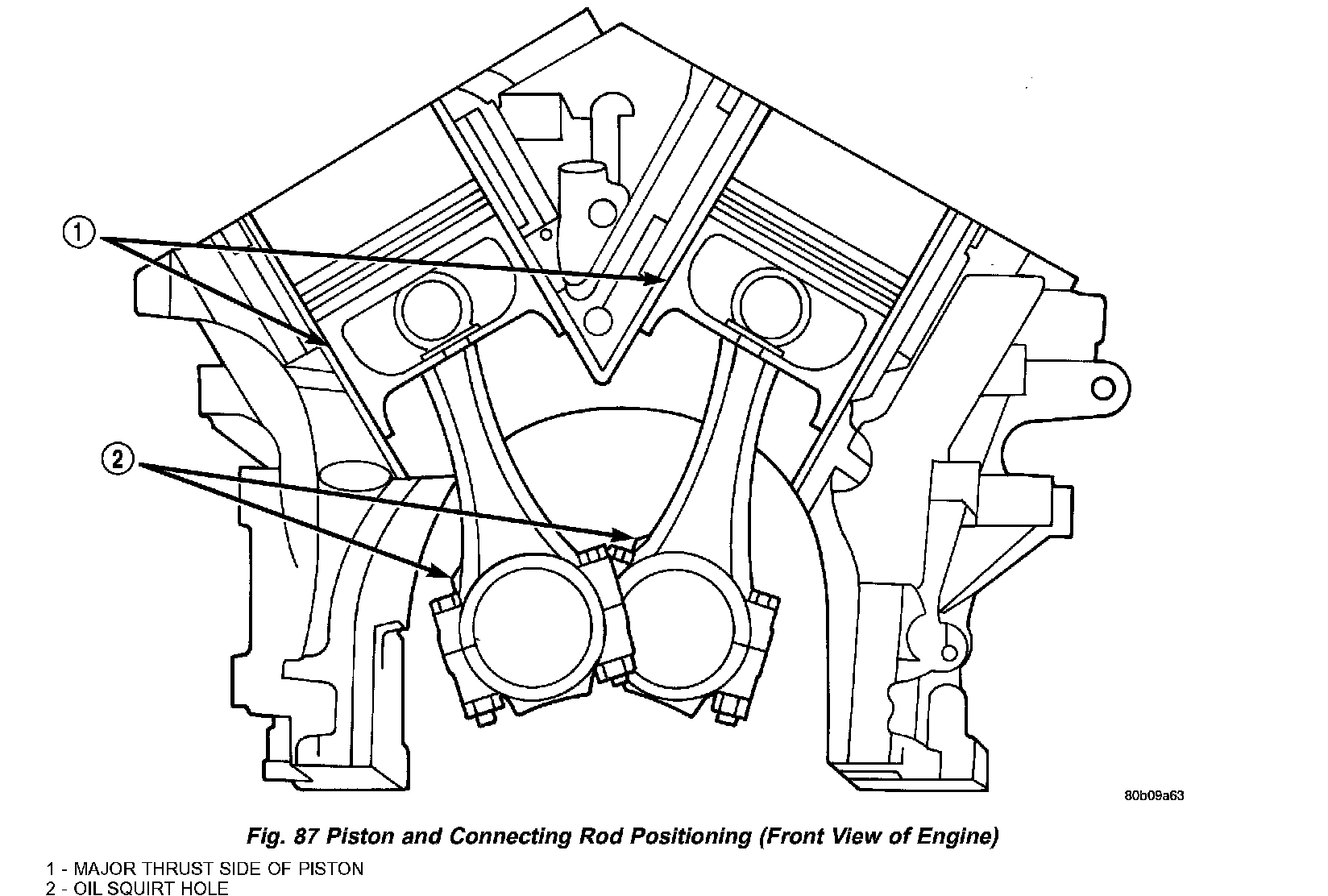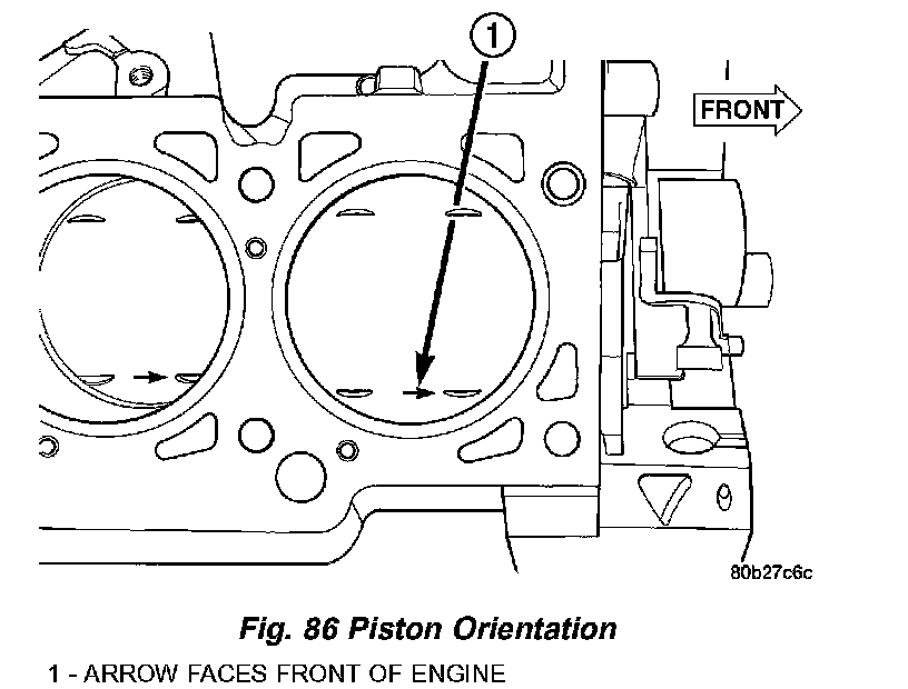 7. The arrow on top of piston must be pointing toward front of engine (Fig. 86) and oil squirt hole on connecting rod faces the major thrust (right) side of the cylinder bore (Fig. 87).