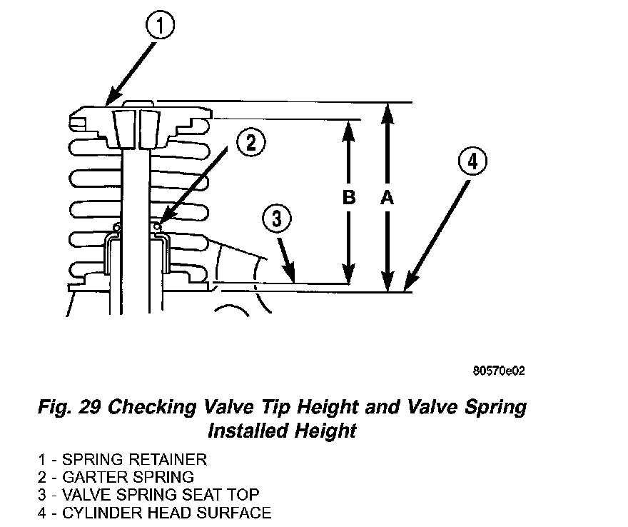 6. If valves and/or seats are refaced, measure the installed height of springs (B) (Fig. 29). Measurements are taken from top of spring seat to the bottom surface of spring retainer. If height is greater than 38.75 mm (1.5256 in.), install a 0.762 mm (0.030 in.) spacer in head counterbore under the valve spring seat to bring spring height back within specification.