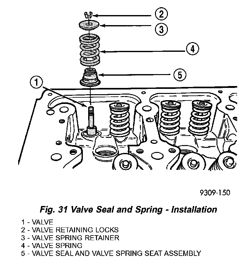 3. Install valve seal/spring seat assembly over valve guides on all valve stems (Fig. 31). Ensure that the garter spring is intact around the top of the rubber seal.