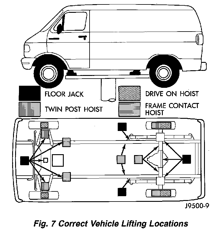 When properly positioned, a floor jack can be used to lift a Ram Van or Wagon (Fig. 7). Support the vehicle in the raised position with jack stands at the front and rear ends of the frame rails.