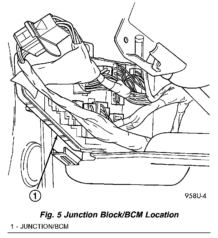 The Junction Block (JB) and Body Control Module (BCM) are attached to each other. After removal they can be separated. Junction Block and Body Control Module assemblies are located on the driver's side of the vehicle (Fig. 5).