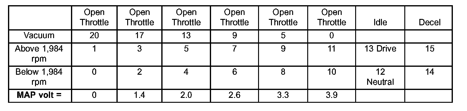 The number of cells varies upon the driving conditions. Two cells are used only during idle, based upon TPS and Park/Neutral switch inputs. There may be two other cells used for deceleration, based on TPS, engine rpm, and vehicle speed. The other twelve cells represent a manifold pressure and an rpm range. Six of the cells are high rpm and the other six are low rpm. Each of these cells has a specific MAP voltage range Typical Adaptive Memory Fuel Cells.