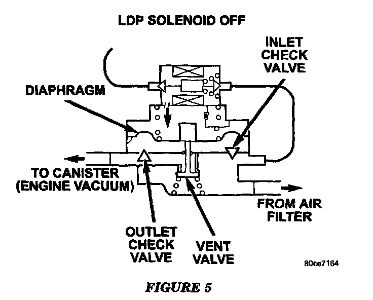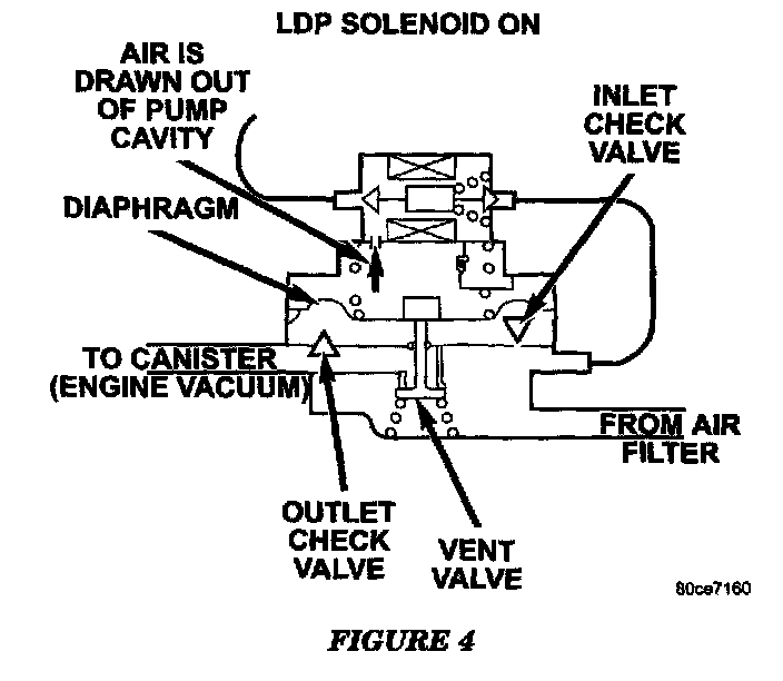 When the PCM energizes the LDP solenoid, the solenoid blocks the atmospheric port leading through the EVAP air filter and at the same time opens the engine vacuum port to the pump cavity above the diaphragm. The diaphragm moves upward when the vacuum above the diaphragm exceeds spring force. This upward movement closes the vent valve. It also causes low pressure below the diaphragm, unseating the inlet check valve and allowing air in from the EVAP air filter. When the diaphragm completes its upward movement, the LDP reed switch turns from closed to open.