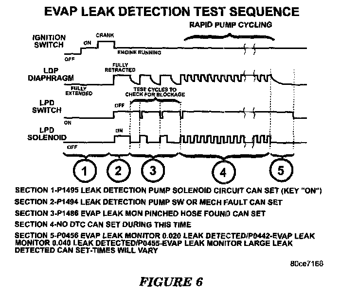 During diagnosis, you can compare the LDP solenoid activity with the monitor sequence in Figure 6. If the PCM detects a problem that could set a DTC, the testing is halted and LDP solenoid activity will stop. As each section of the test begins, it indicates that the previous section passed successfully. By watching to see which tests complete, you can see if any conditions are present that the PCM considers abnormal.