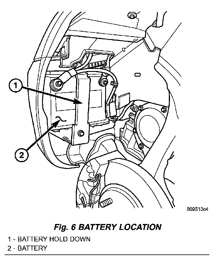 6. Remove the short bolt from the battery hold down and remove the hold down (Fig. 6).