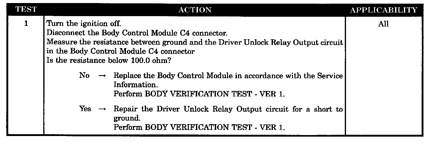 DRIVER DOOR FAILS TO UNLOCK FROM ANY SWITCH