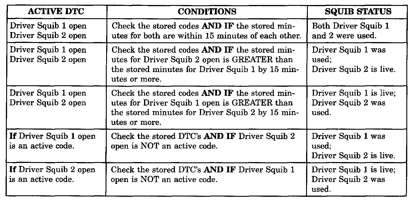 Airbag codes are automatically stored in the ORC's memory as soon as the malfunction is detected. A stored code indicates there was an active code present at some time. However, the code currently may not be present as an active code. When a trouble code occurs, the airbag warning indicator illuminates for 12 seconds minimum (even if the problem existed for less than 12 seconds). The code is stored, along with the time in minutes it was active, and the number of times the ignition has been cycled since the problem was last detected. The minimum time shown for any code will be one minute, even if the code was actually present for less than one minute. Thus, the time shown for a code that was present for two minutes 13 seconds, for example, would be three minutes. If a malfunction is detected a diagnostic trouble code is stored and will remain stored. When and if the malfunction ceases to exist, an ignition cycle count will be initiated for that code. If the ignition cycle count reaches 100 without a reoccurrence of the same malfunction, the diagnostic trouble code is erased and that ignition cycle counter is reset to zero. If the malfunction reoccurs before the count reaches 100, then the ignition cycle counter will be reset and the diagnostic trouble code will continue to be a stored code. If a malfunction is not active while performing a diagnostic test procedure, the active code diagnostic test will not locate the source of the problem. In this case, the stored code can indicate an area to inspect. It no obvious problems are found, erase stored codes, and with the ignition on wiggle the wire harness and connectors, rotate the steering wheel from stop to stop. Recheck for codes periodically as you work through the system. This procedure may uncover a malfunction that is difficult to locate.