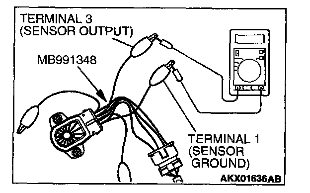 2. Connect a digital voltmeter between throttle position sensor terminal No.3 (sensor output) and terminal No.1 (sensor ground).
