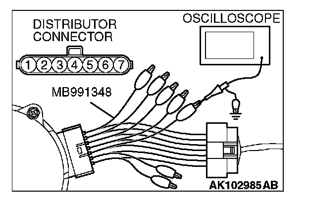 1. Disconnect the connector, and connect test harness special tool, (MB991348), in between. (All terminals should be connected.)