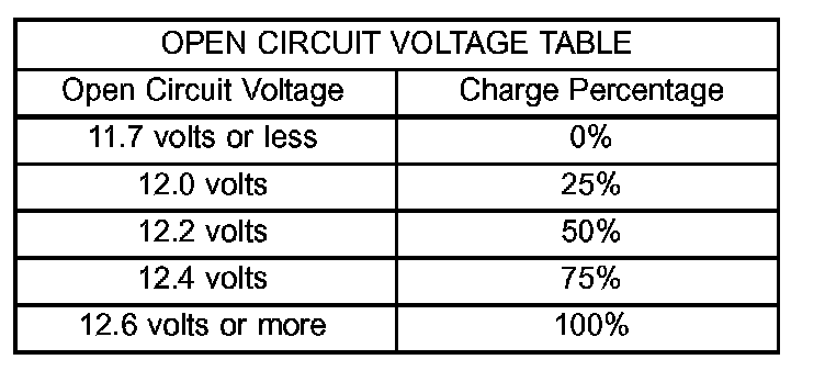 See the Open-Circuit Voltage Table. This voltage reading will indicate the battery state-of-charge, but will not reveal its cranking capacity. If a battery has an open-circuit voltage reading of 12.4 volts or greater, it may be load tested to reveal its cranking capacity. Refer to Standard Procedures for the proper battery load test procedures.