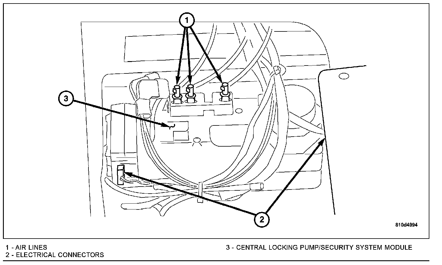 5. Disconnect the air lines (1) and the electrical connectors (2) from the central locking pump/security system module (3) and remove the module.