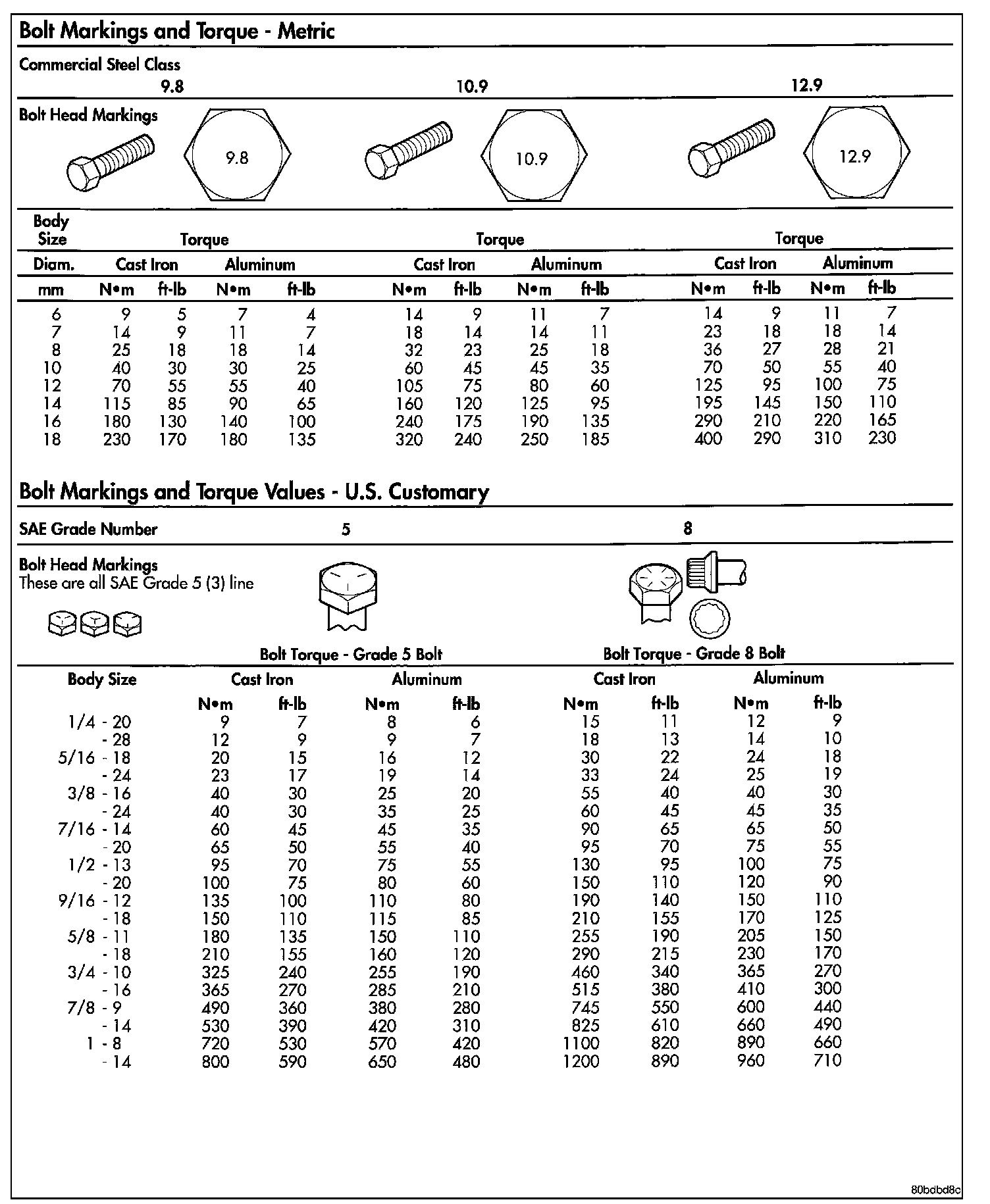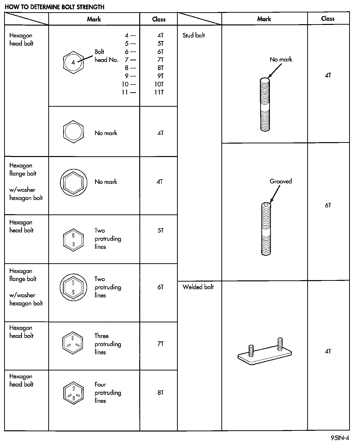 The SAE bolt strength grades range from grade 2 to grade 8. The higher the grade number, the greater the bolt strength. Identification is determined by the line marks on the top of each bolt head. The actual bolt strength grade corresponds to the number of line marks plus 2. The most commonly used metric bolt strength classes are 9.8 and 10.9. The metric strength class identification number is imprinted on the head of the bolt. The higher the class number, the greater the bolt strength. Some metric nuts are imprinted with a single-digit strength class on the nut face. Refer to the Fastener Identification and Fastener Strength Charts.