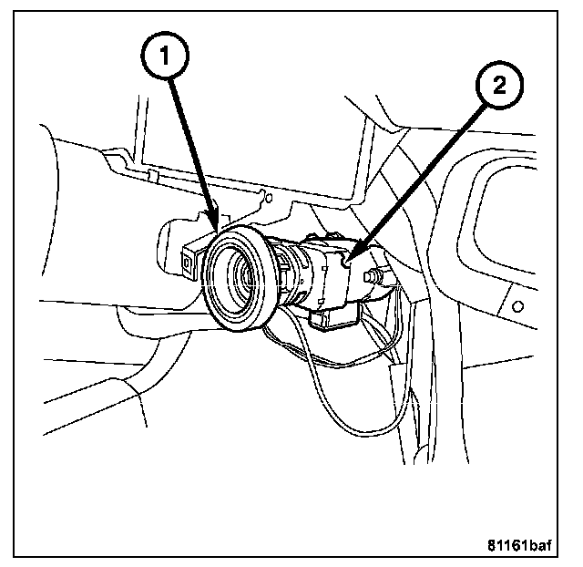 1. Install the sentry key antenna ring (1) to the ignition switch key cylinder (2).