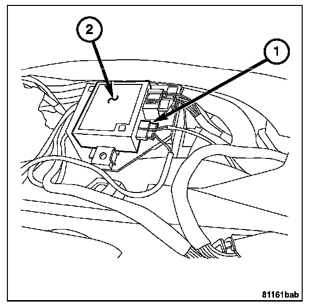 2. Install the sentry key antenna ring electrical connector (1) to the sentry key remote entry module (2).