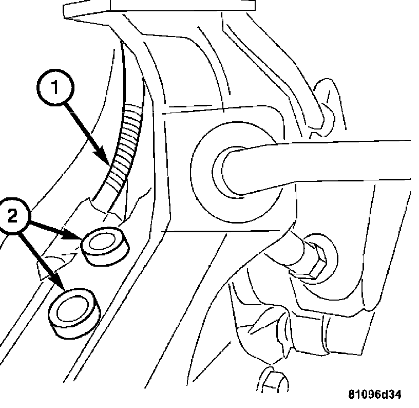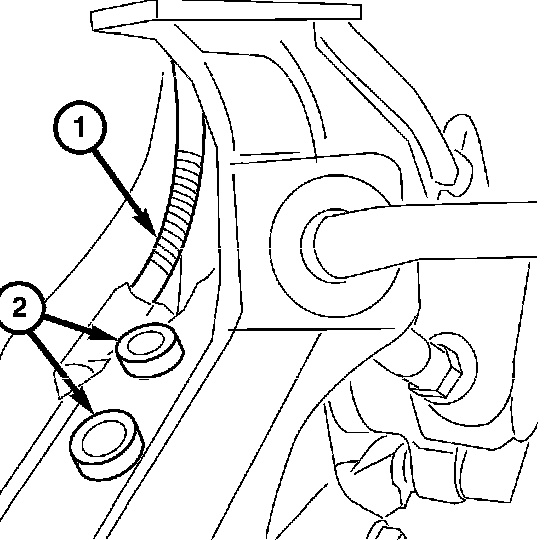 3. Disconnect the wheel speed/brake wear indicator wire harness connector (2) from the body mount connector (1).