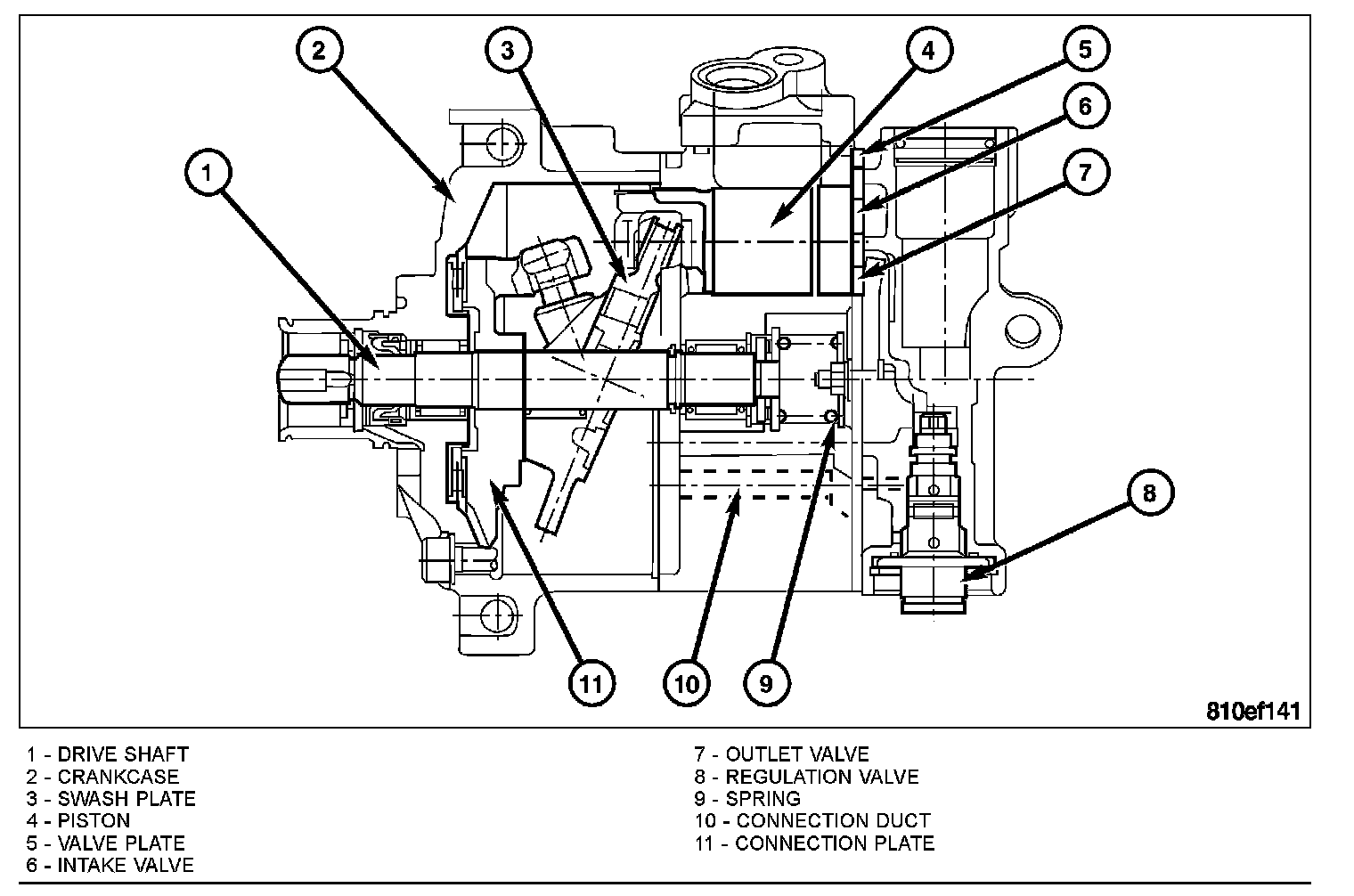 After the electromagnetic clutch has produced the frictional connection between the engine and the compressor, the drive shaft (1) drives the swash plate (3). The rotation of the inclined swash plate (3) causes the pistons (4) to move in strokes. During the intake stroke, refrigerant vapor is sucked in via the inlet valve (6). If the piston (4) moves in the counter direction, it delivers the refrigerant vapor via the pressure control valve (7), with the vapor being compressed and heating up, into the refrigerant line to the condenser.