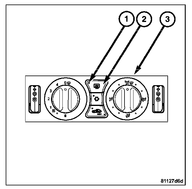 The heater switch (3) is illuminated with LEDs whenever the headlamps or marker lamps are on. The lamp brightness is adjustable with the dimmer switch located in the instrument cluster. The heater switch LEDs cannot be adjusted or repaired. If faulty or damaged, the entire heater switch assembly must be replaced as a unit. For complete heater switch removal procedures, see heater control removal in the heating and air conditioning section.