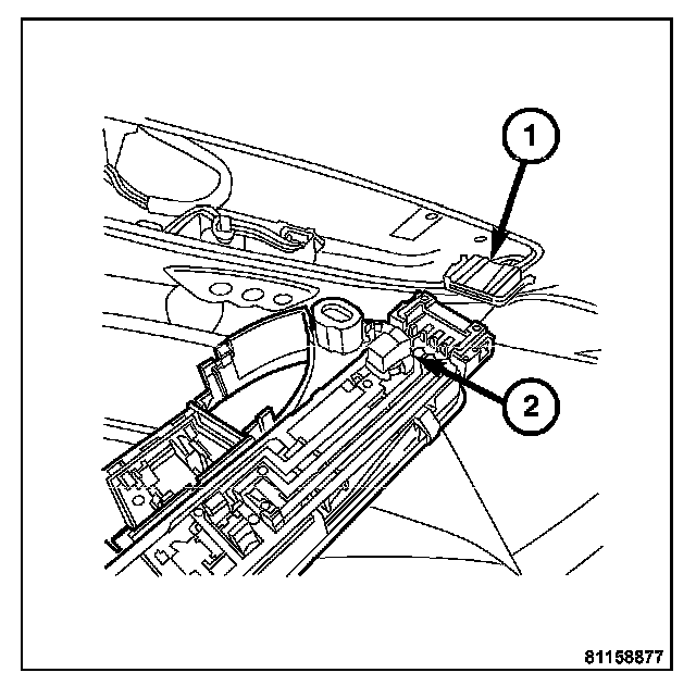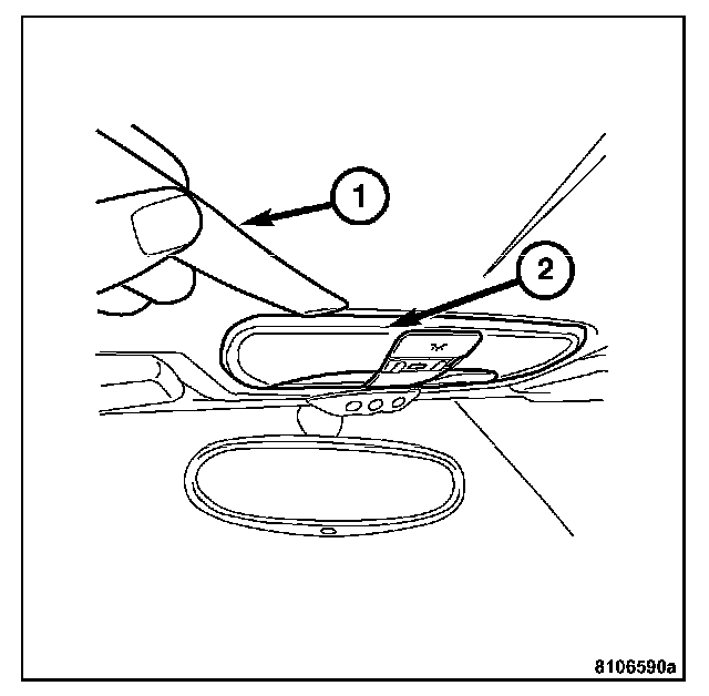 2. Using a trim stick (1) press the clips located on the edge of the courtesy lamp switch/unit body (2) and release the lens cover.