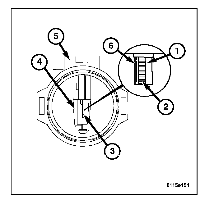 The MAF controls the temperature of the heating resistor (6) by means of a variable voltage so its temperature is 160° C (320° F) above the intake air temperature detected by the temperature resistor (1).