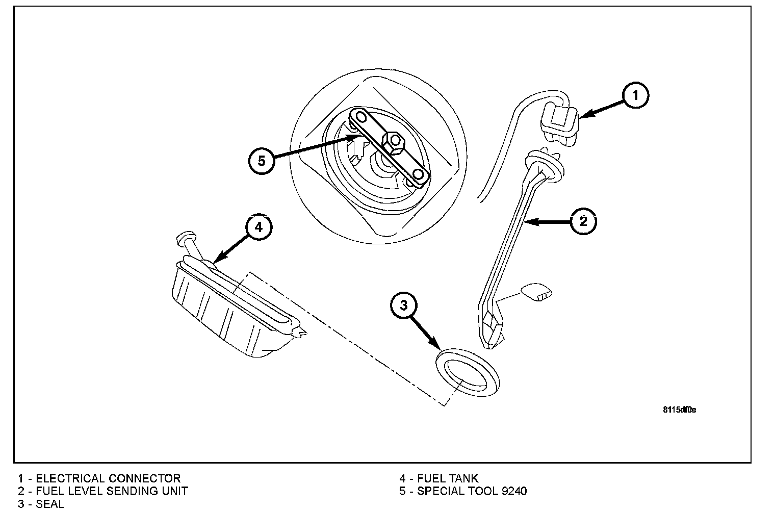 6. Install Special Tool 9240 (5) and rotate the fuel level sending unit/sensor (2) counterclockwise.