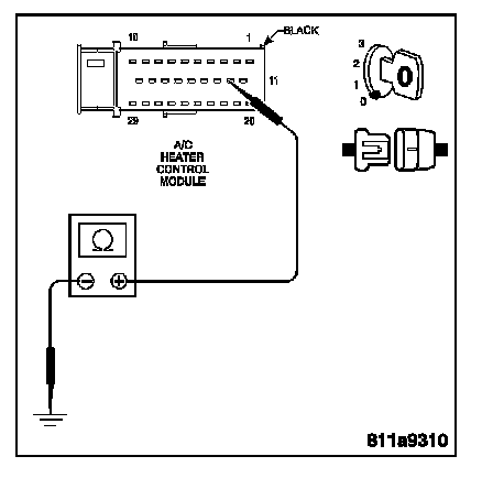 Measure the resistance of the Ground circuit from the A/C Heater Control Module harness connector.