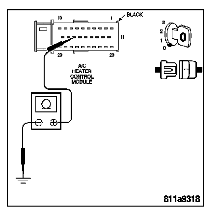 Measure the voltage of the Fused Ignition Switch Output circuits at the A/C Heater Control Module harness connector.