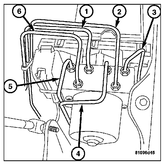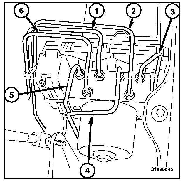 4. Install the brake lines (1-6). Pay close attention to the markings when attaching the hydraulic lines.