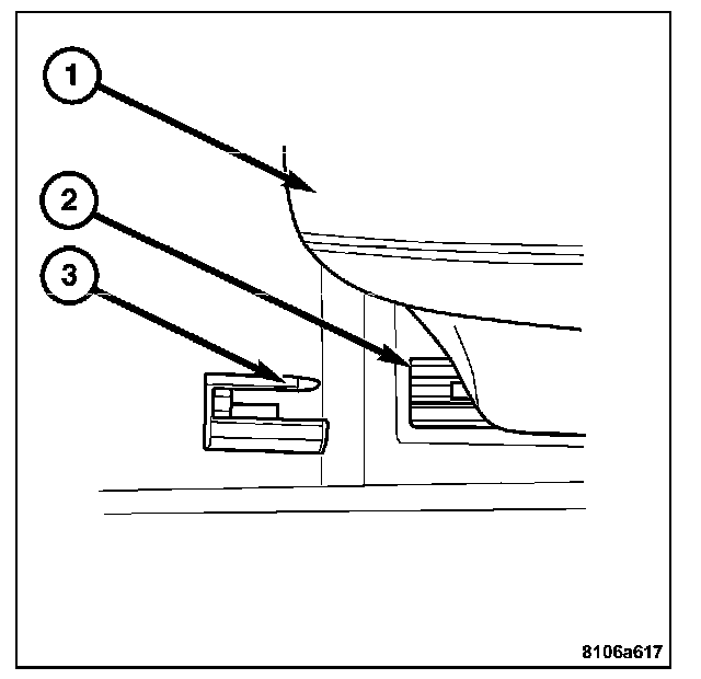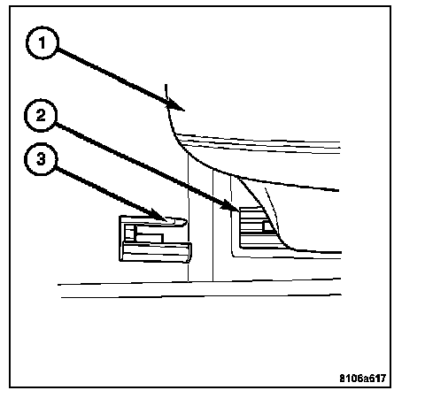 8. Remove the carpet hold down (3) at the rear wall (1).