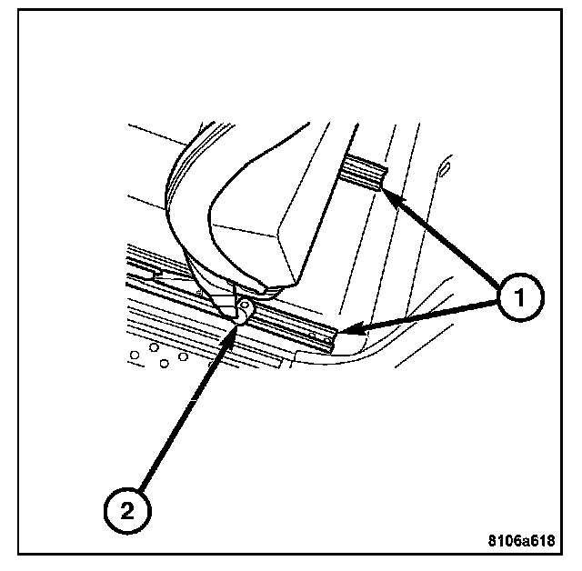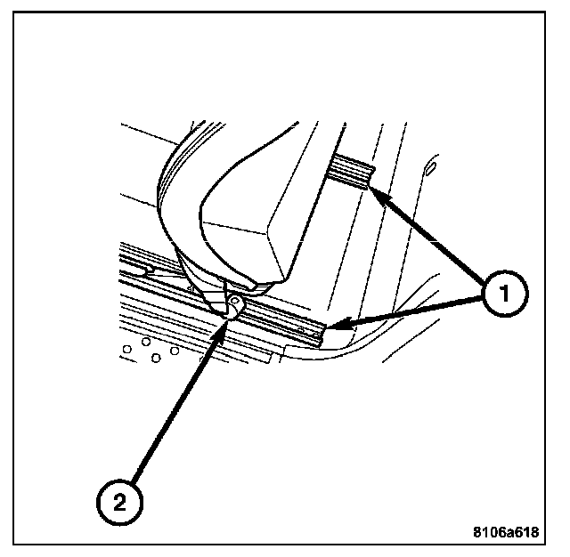8. Install the rear seat bolts (1) then install the seat belt and bolt (2).