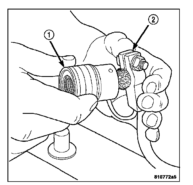 1. Clean the battery cable terminal clamps (2) of all corrosion. Remove any corrosion using a wire terminal brush (1) or a post and terminal cleaning tool, and a sodium bicarbonate (baking soda) and warm water cleaning solution.