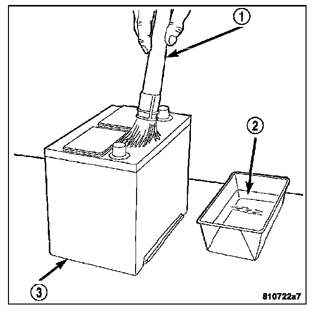 3. If the removed battery (3) is to be reinstalled, clean the outside of the battery case and the top cover with a sodium bicarbonate (baking soda) and warm water cleaning solution (2) using a stiff bristle parts cleaning brush (1) to remove any acid film. Rinse the battery with clean water. Ensure that the cleaning solution does not enter the battery cells through the vent holes. If the battery is being replaced, refer to Battery System Specifications for the factory-installed battery specifications. Confirm that the replacement battery is the correct size and has the correct ratings for the vehicle.