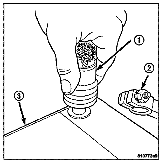 4. Clean any corrosion from the battery (3) and the battery terminal posts and battery cables (2) with a wire brush or a post and terminal cleaner (1), and a sodium bicarbonate (baking soda) and warm water cleaning solution.
