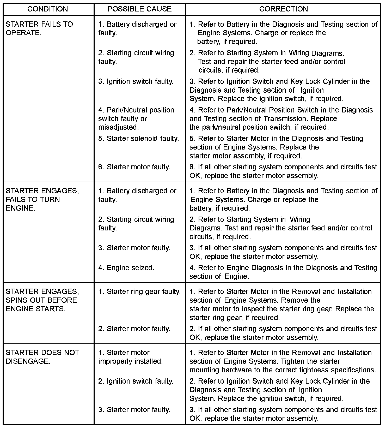 For complete wiring diagrams, refer to Starting System in the Contents of Wiring Diagrams. Before removing any unit from the starting system for repair or diagnosis, perform the following inspections: