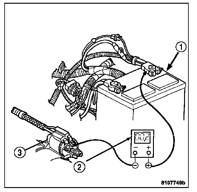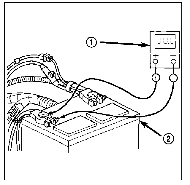 1. Connect the positive lead of the voltmeter (1) to the battery. (2)negative terminal post. Connect the negative lead of the voltmeter (1) to the battery (2) negative cable clamp. Rotate and hold the ignition switch in the Start position. Observe the voltmeter. If voltage is detected, correct the poor contact between the cable clamp and the terminal post.
