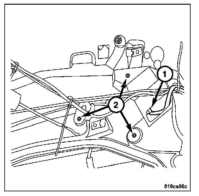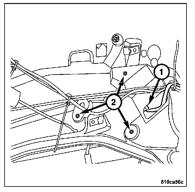 4. Disconnect the power window motor harness connector (1), and drill out the power window motor attachment rivets (2).