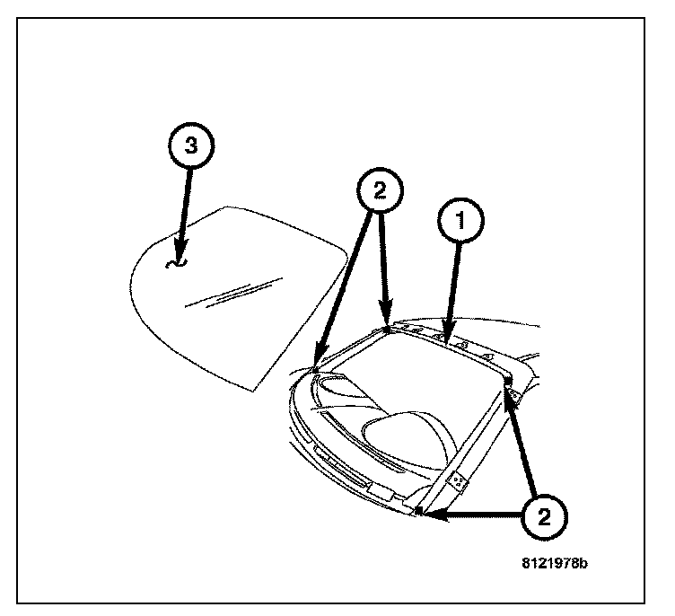 12. Slowly lower windshield glass to windshield opening fence (1). Guide velcro-stabilizers at the lower edge of the replacement windshield into proper position as necessary. Push windshield inward to fence spacers (2) at top and bottom until top is flush to roof line.