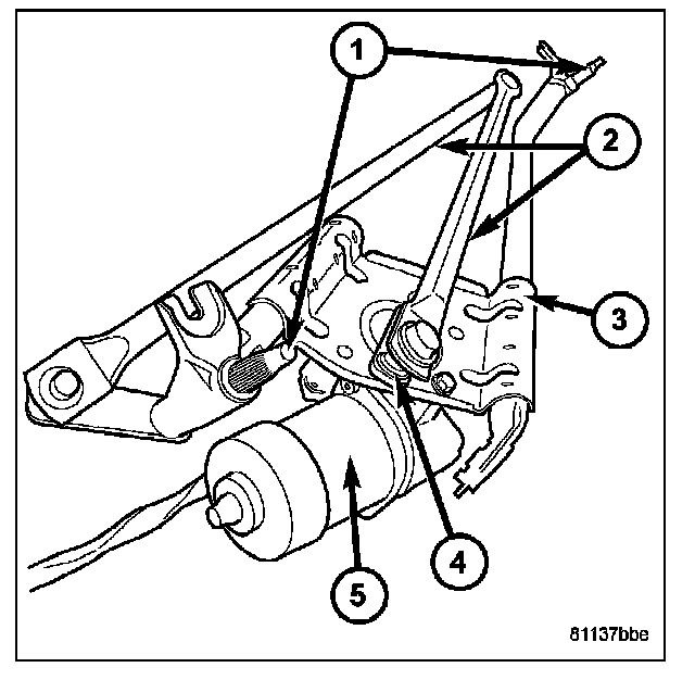 The wiper module holds the wiper motor and is secured with two nuts on studs and one bolt, each through rubber isolators to the cowl plenum panel. The ends of the two wiper pivot shafts that protrude through openings in the cowl grille panel and drive the wiper arms are the only visible components of the wiper module on the exterior of the vehicle. The wiper module consists of the following major components: