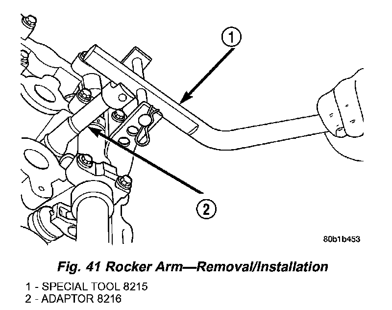 3. Using Special Tools 8215 and 8216 Adaptor, depress valve spring only enough to release tension on rocker arm (Fig. 41).
