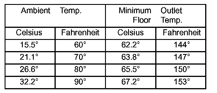 Engine coolant is provided to the heater system by two 19 mm (3/4 inch inside diameter) heater hoses. With engine idling at normal running temperature, set the control to maximum heat, floor, and high blower setting. Using a test thermometer, check the air temperature coming from the floor outlets. Refer to Temperature Reference Table.