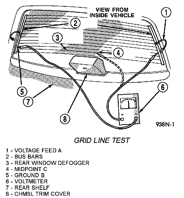 The horizontal grid line and vertical bus bar line is printed and fired on the inside surface of the rear window glass. These comprise an electrical circuit. The electrically conductive lines are composed of a silver ceramic material which when fired on glass becomes bonded to the glass and is highly resistant to abrasion. It is possible, however, that a break may occur in an individual grid line resulting in no current flow through the line. To detect breaks in grid lines, the following procedure is required:1. Stop the engine. Connect the negative lead of a 0-25 volt range voltmeter to a known good vehicle electrical ground.