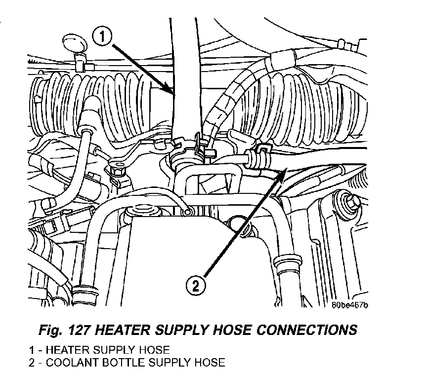 8. Connect heater and coolant bottle supply hoses to coolant tube at rear of intake manifold (Fig. 127).