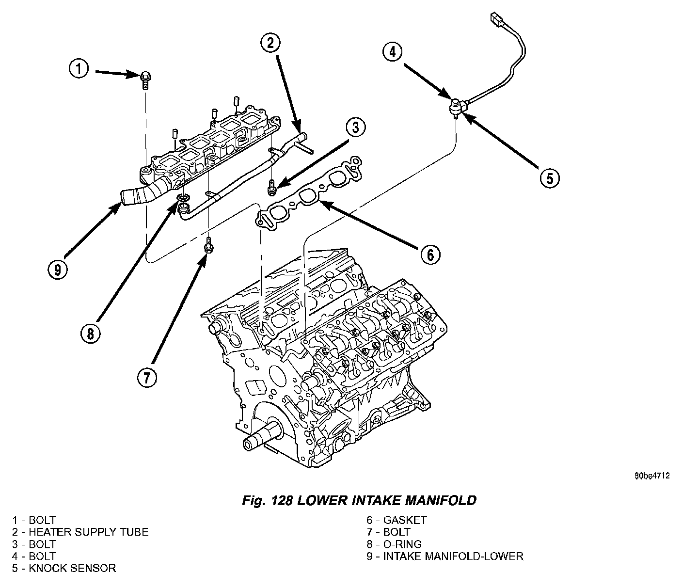 11. Remove bolts attaching lower intake and remove intake manifold (Fig. 128).