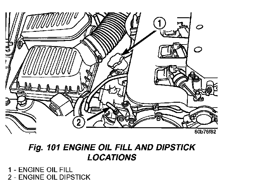 Checking the oil while the vehicle is on level ground will improve the accuracy of the oil level reading (Fig. 101). Add only when the level is at or below the ADD mark.