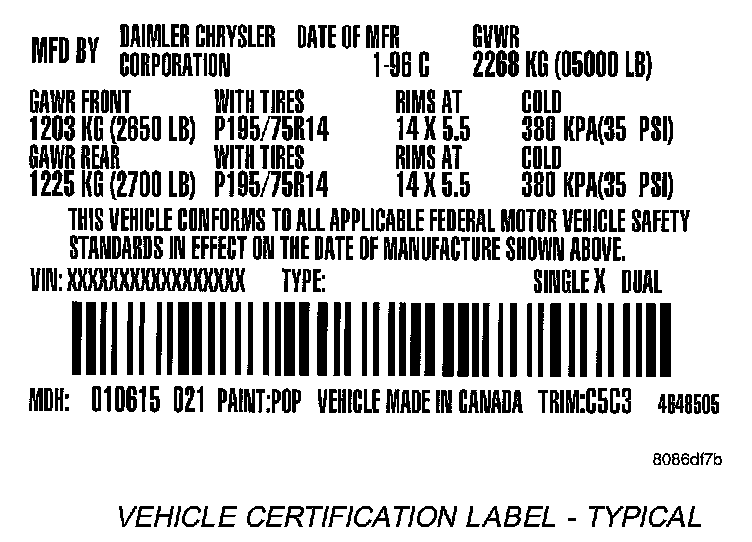 A vehicle certification label is attached to the rear shutface of the driver's door. This label indicates date of manufacture (month and year), Gross Vehicle Weight Rating (GVWR), Gross Axle Weight Rating (GAWR) front, Gross Axle Weight Rating (GAWR) rear and the Vehicle Identification Number (VIN). The Month, Day and Hour of manufacture is also included.
