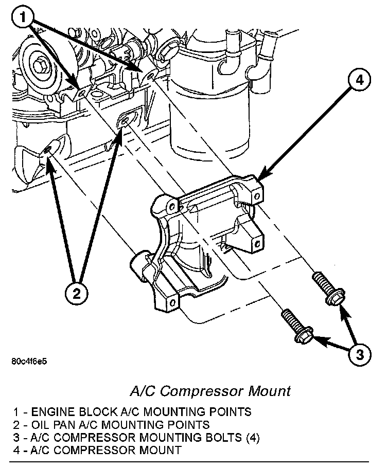 2. Remove four mounting bolts from A/C compressor mount. Two from engine block and two from oil pan.