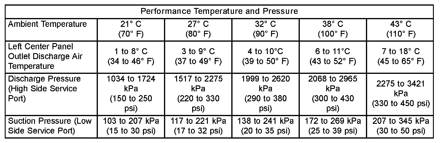 7. With the compressor clutch engaged, record the left center panel outlet discharge air temperature, the discharge pressure (high side service port), and the suction pressure (low side service port). The compressor clutch may cycle, depending upon the ambient temperature and humidity. If the clutch cycles, use the readings obtained before the clutch disengaged.