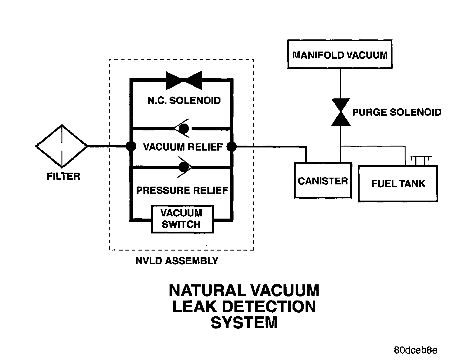 The Natural Vacuum Leak Detection (NVLD) system is the next generation evaporative leak detection system that will first be used on vehicles equipped with the Powertrain Control Module (PCM) or Next Generation Controller (NGC) starting in 2002 M.Y. This new system replaces the leak detection pump as the method of evaporative system leak detection. The current CARB requirement is to detect a leak equivalent to a 0.020 inches (0.5 mm) hole. This system has the capability to detect holes of this size very dependably.