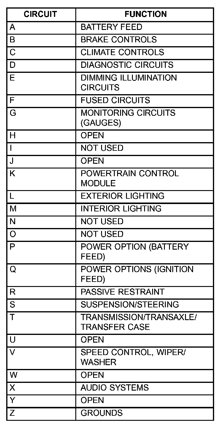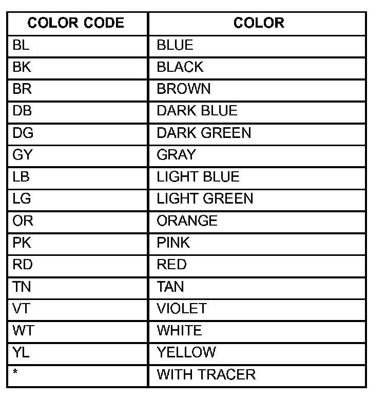 All circuits in the diagrams use an alpha/numeric code to identify the wire and it's function. To identify which circuit code applies to a system, refer to the Circuit Identification Code Chart. This chart shows the main circuits only and does not show the secondary codes that may apply to some models.