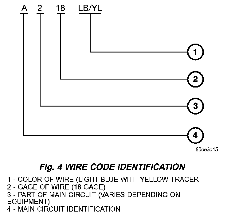 Each wire shown in the diagrams contains a code which identifies the main circuit, part of the main circuit, gage of wire, and color (Fig. 4).